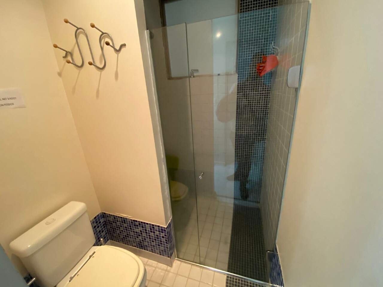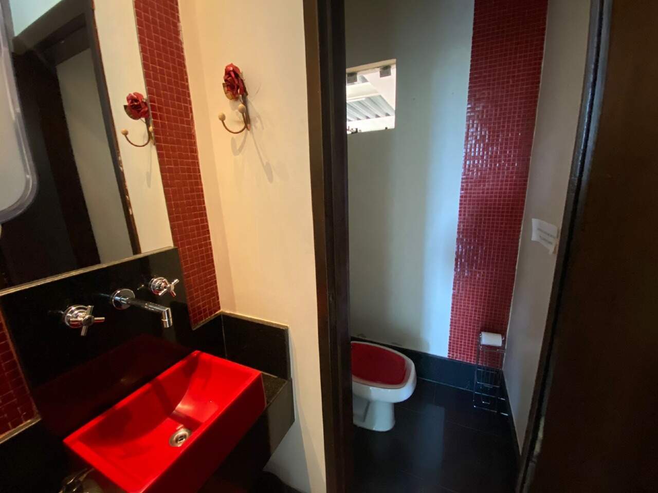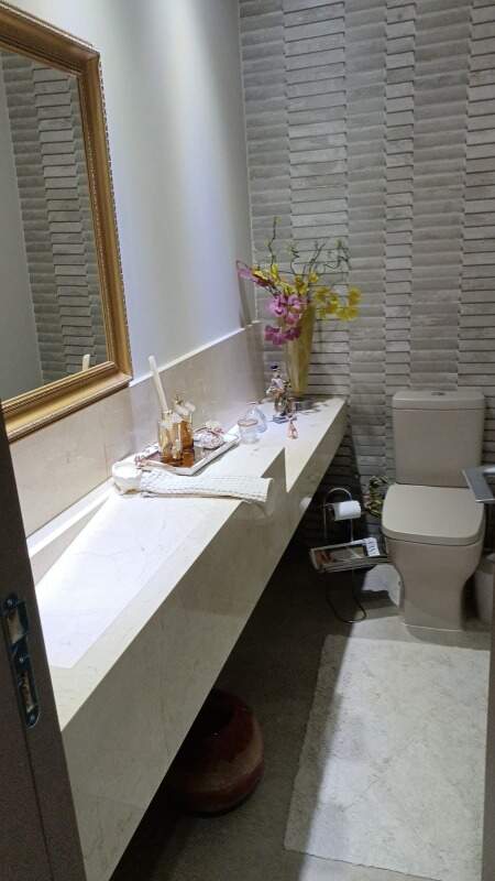 Suíte e banho social com bancada em granito, armário, box em blindex, espelho e piso em granito.