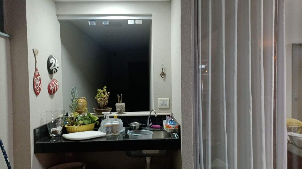 Sala ampla para 02 ambientes com piso em porcelanato, iluminação planejada e rebaixamento em gesso. Varanda gourmet com armarios planejados, piso em ceramica e iluminação planejada.