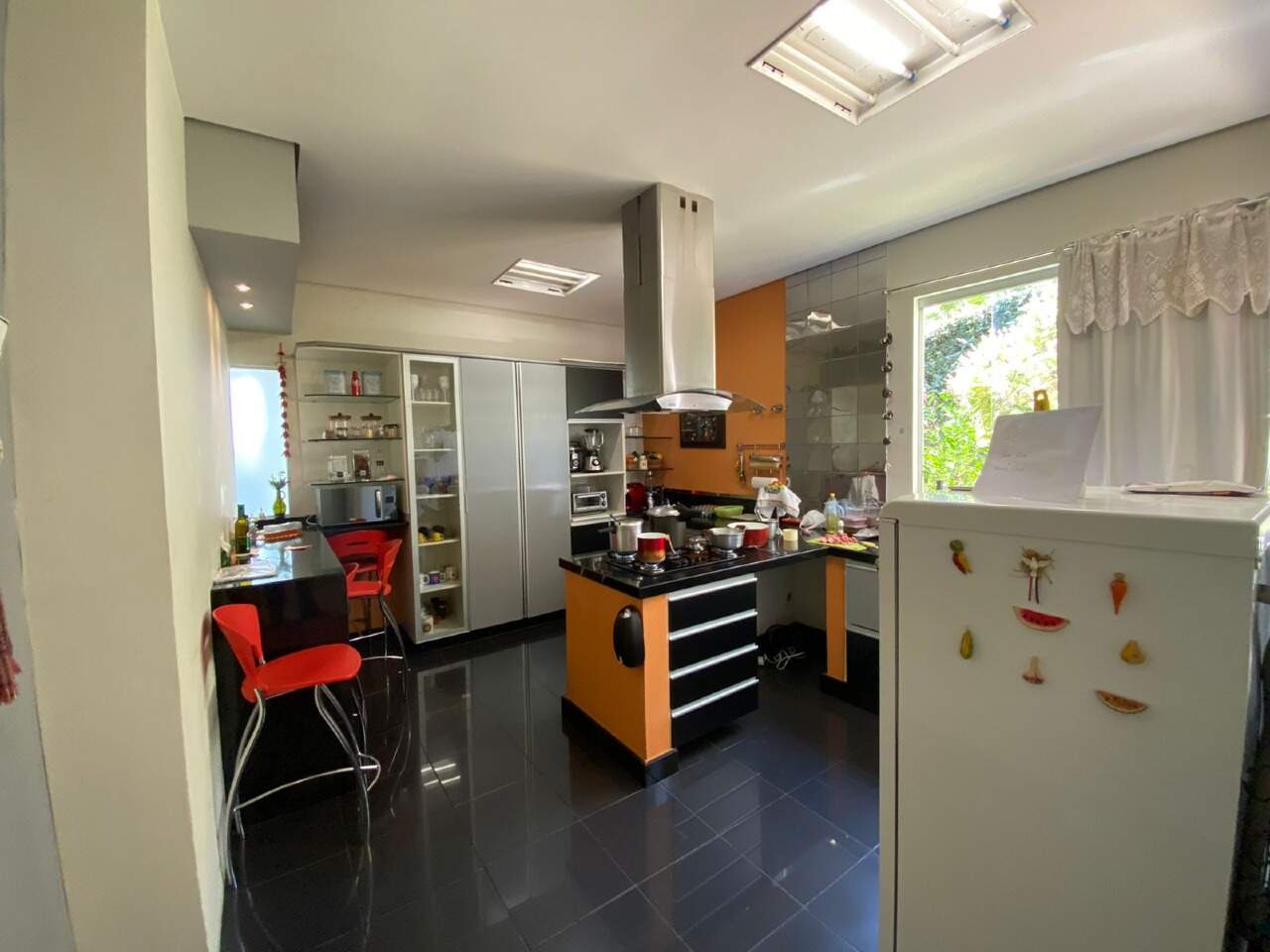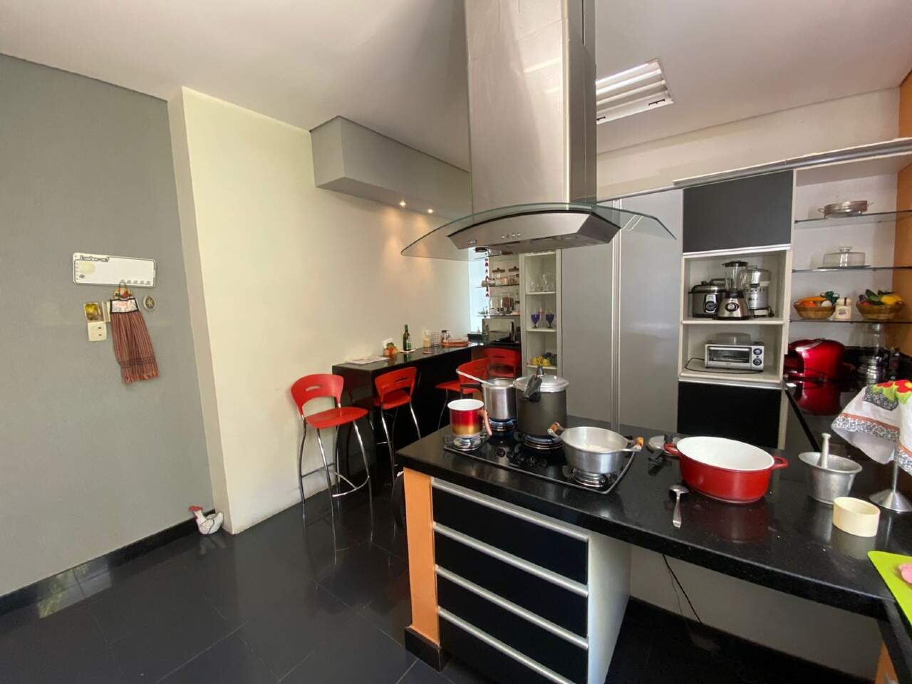 Cozinha americana com armarios planejados, bancadas em granito e piso em porcelanato.