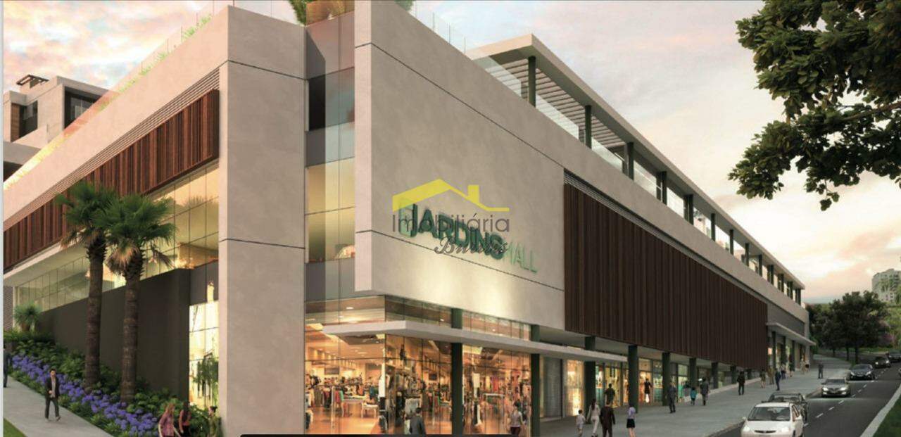 Um centro de compras integrado ao condomínio com 22 lojas e 76 vagas de estacionamento.