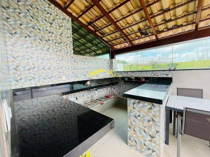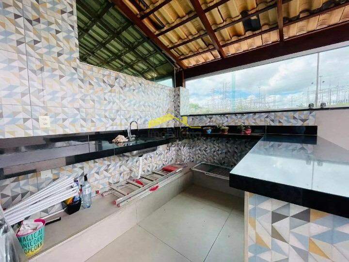 Área externa ampla com piso em porcelanato, bancada em granito, ducha, parte coberta com telha colonial, fechamento em blindex e vista definitiva.