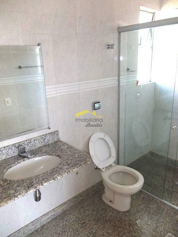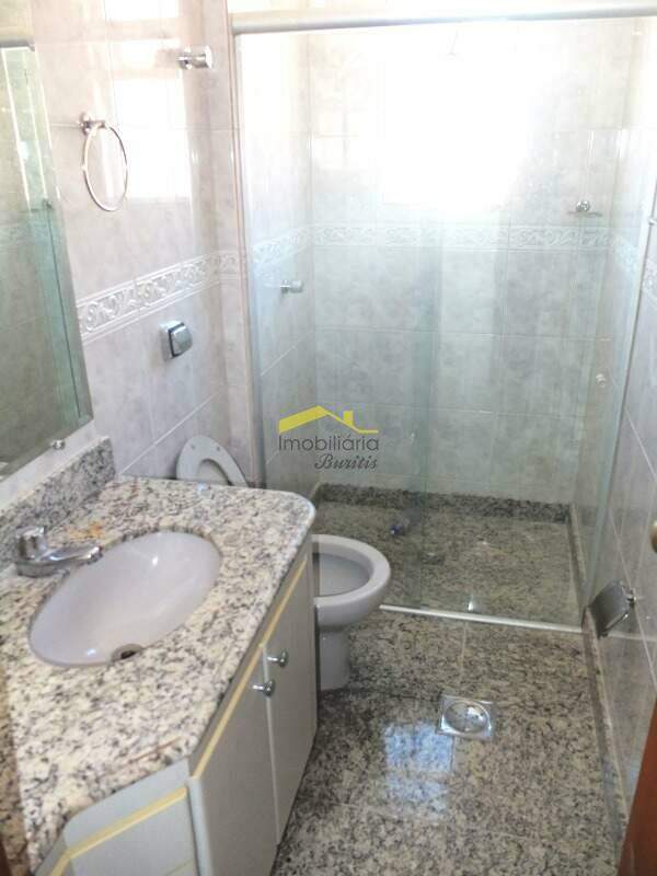 Banheiro social e suíte com piso em granito, box blindex e armários sob bancada em granito.