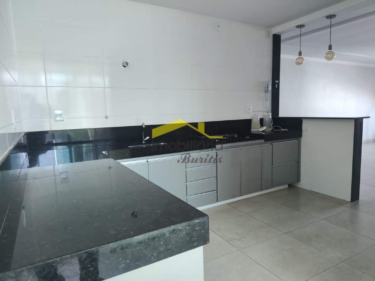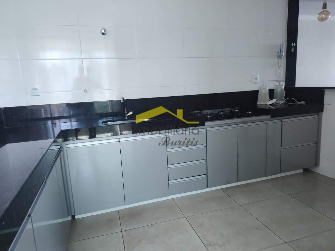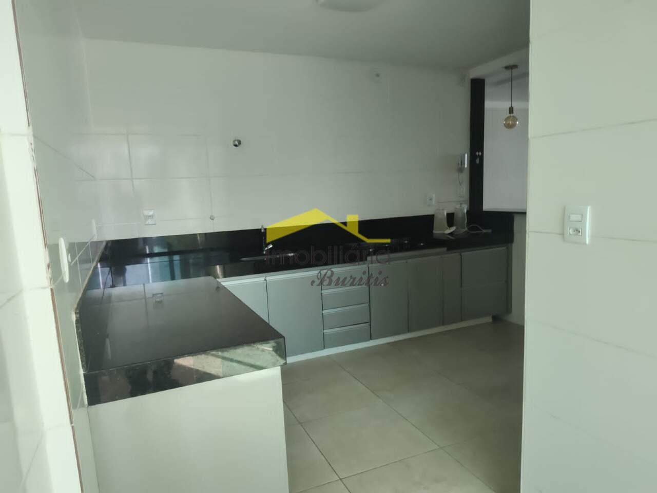 Ampla cozinha americana com armários, piso em porcelanato.
