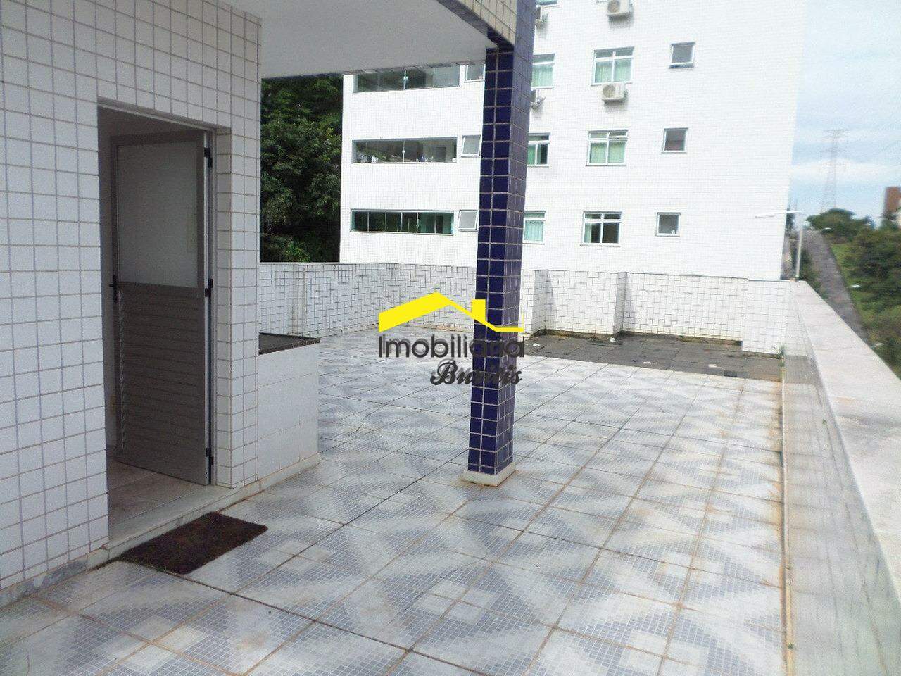 Área externa ampla, com churrasqueira, bancada em granito, ducha e vista definitiva para a cidade
