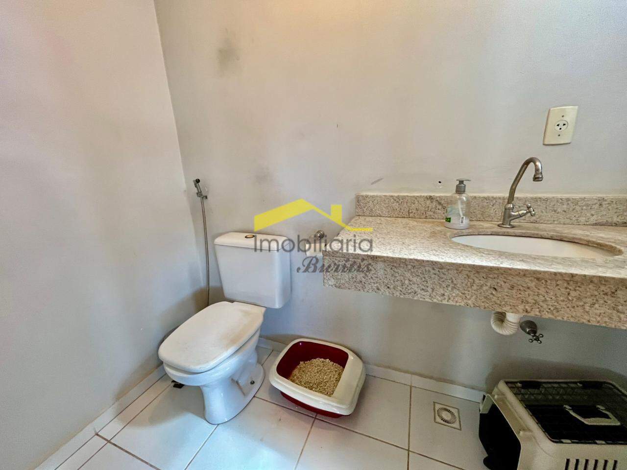Banho social com box blindex, bancada em granito, armários e piso porcelanato; Escada em alvenaria, acabamento em granito;