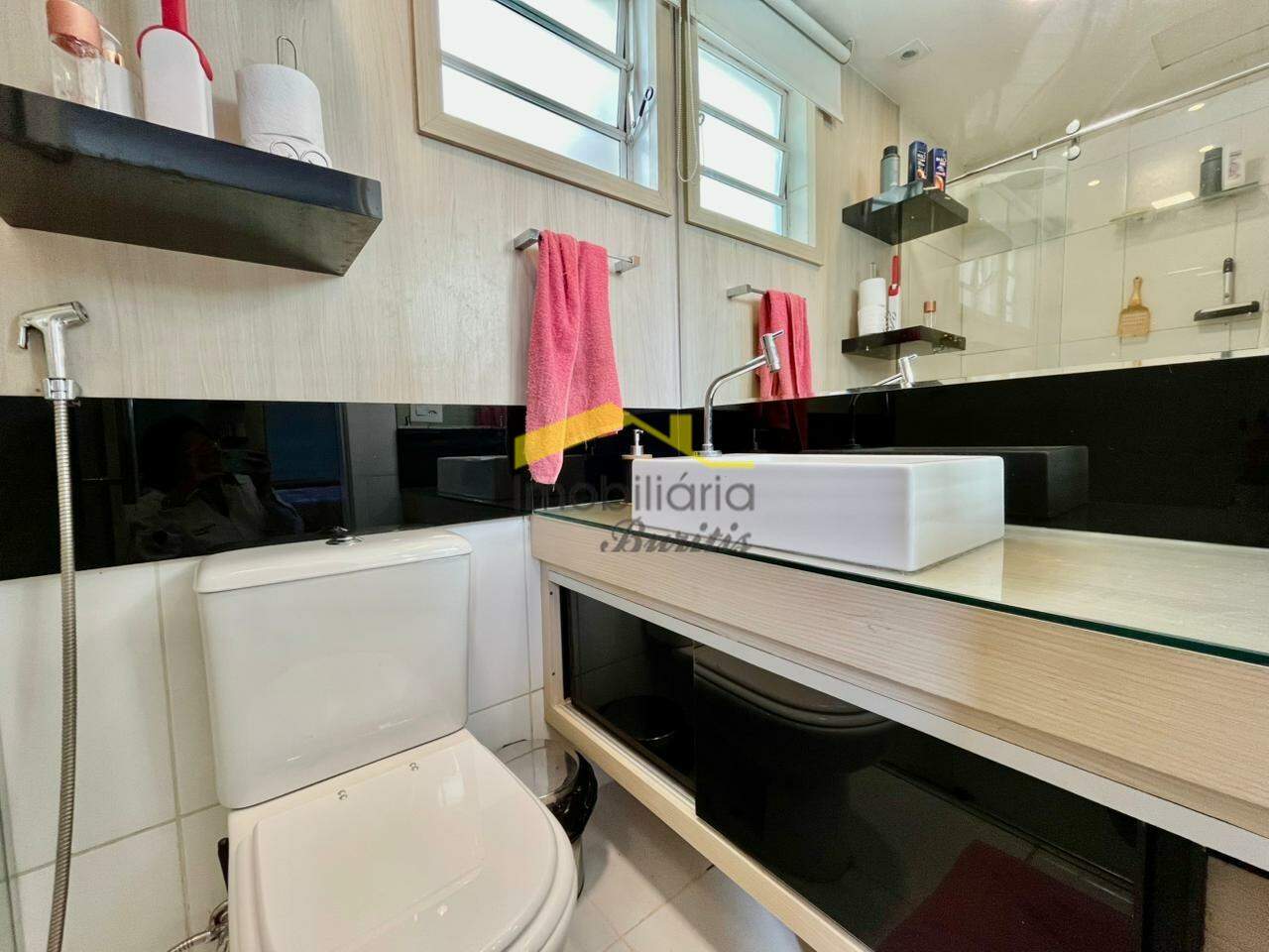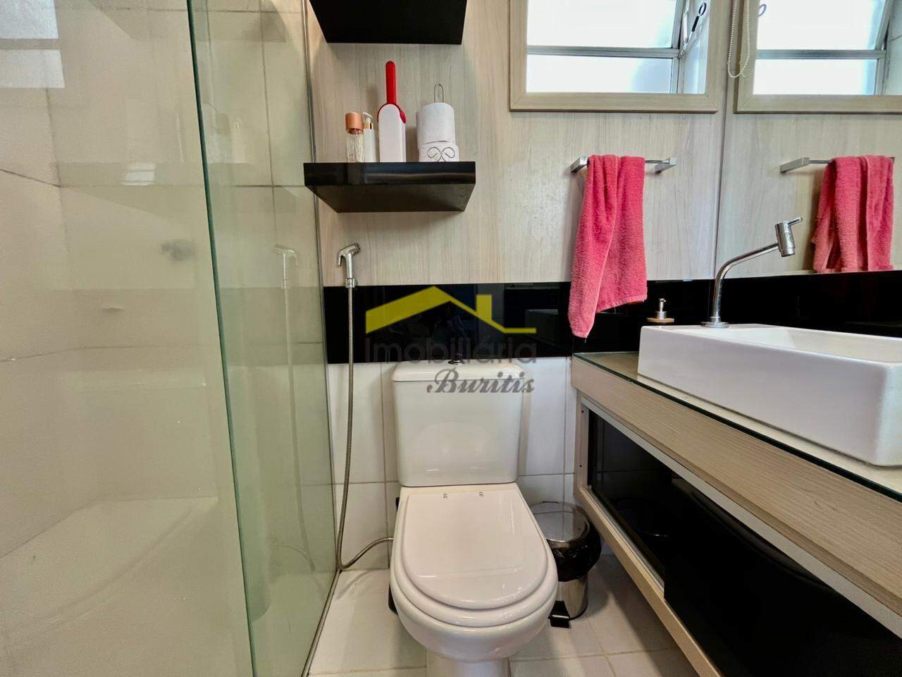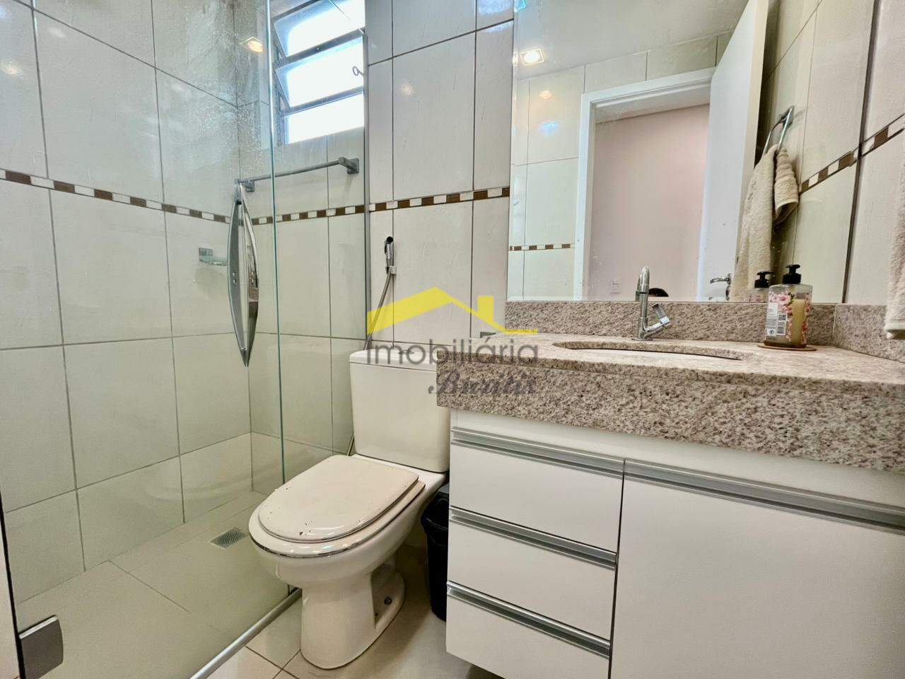 Banho suíte com box blindex, bancada em granito, armários, e piso porcelanato;