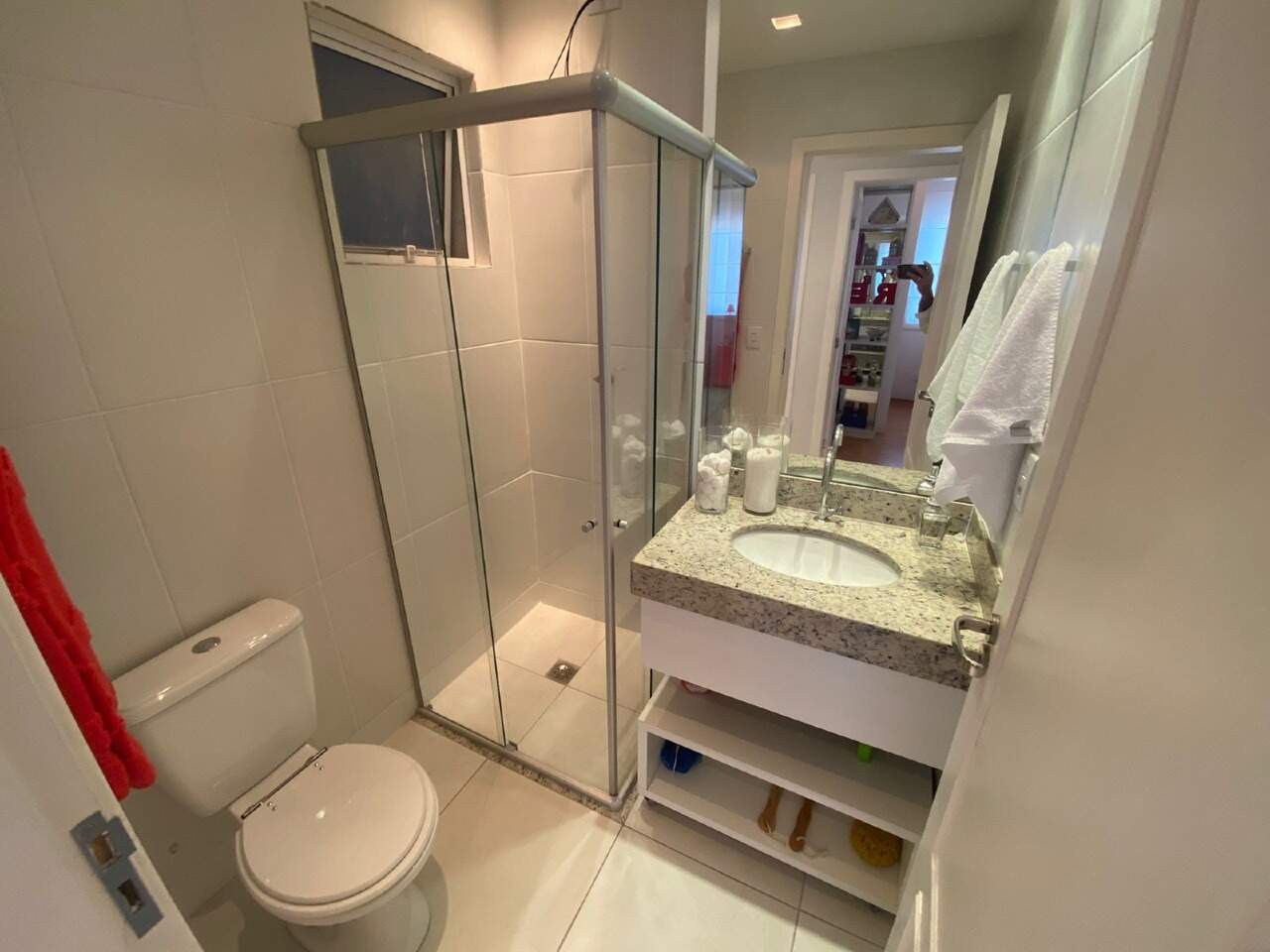 Banho social e suíte com bancada em granito e piso em ceramica.