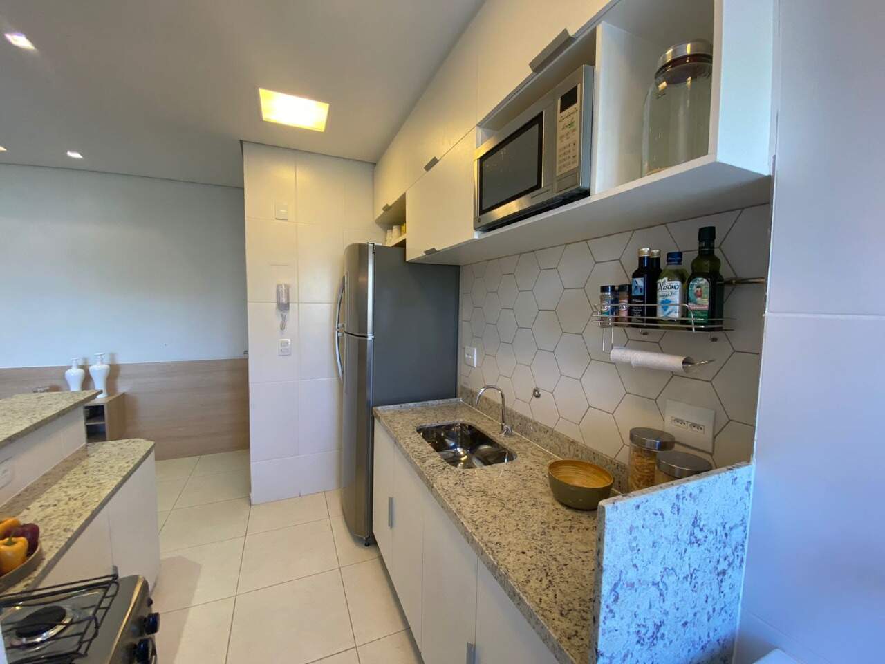 Cozinha americana com piso em ceramica e bancadas em granito.