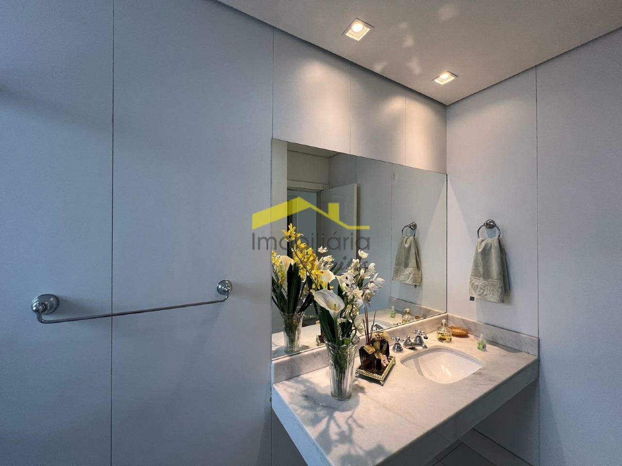 No 1º piso, ampla sala para 03 ambientes com piso em mármore, teto rebaixado em gesso e iluminação planejada. São 03 quartos, sendo 01 suíte com closet e 01 quarto incorporado à sala, todos com piso em laminado e armários planejados. O banho social conta com banheira de hidromassagem, enquanto os banheiros possuem acabamento refinado com bancada em granito, armários planejados, blindex e teto rebaixado. Cozinha moderna com piso em porcelanato, bancadas em granito e armários planejados. Área de serviço e banho de empregada.