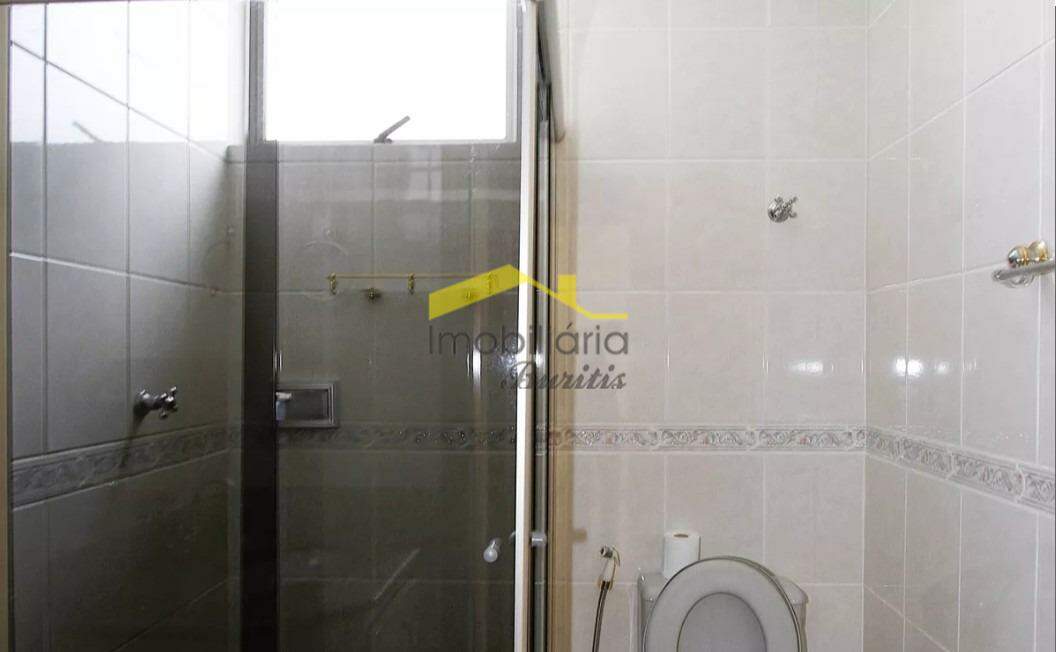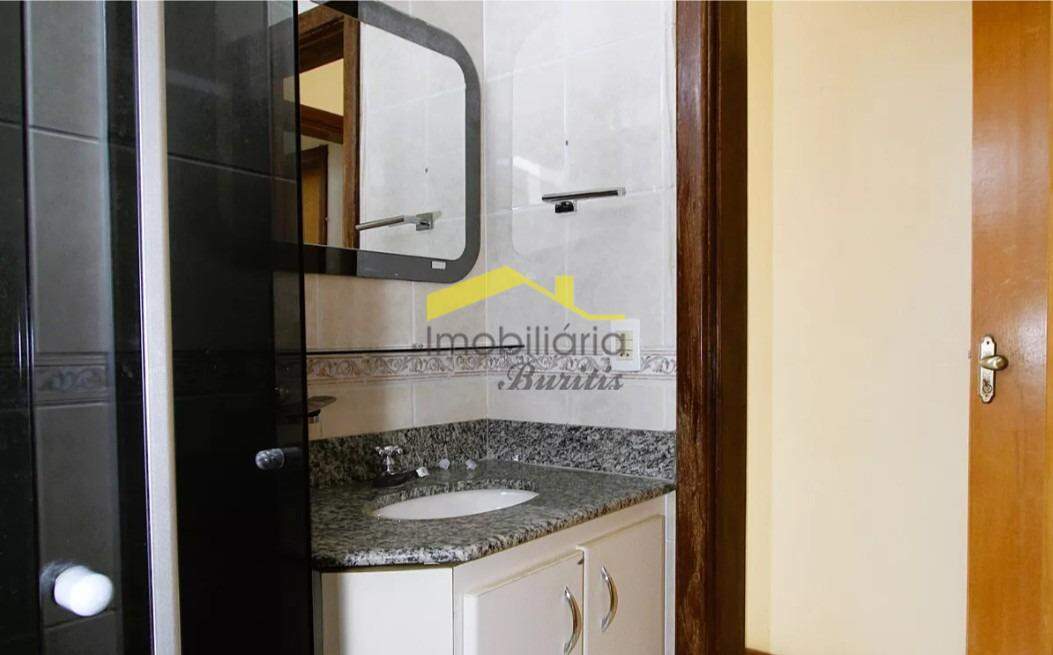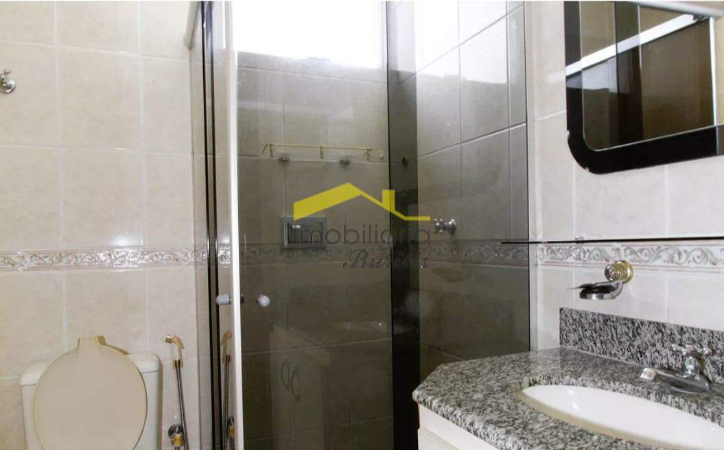 Banho social com box em blindex fumê, ducha de alta pressão e armário sob bancada de granito;