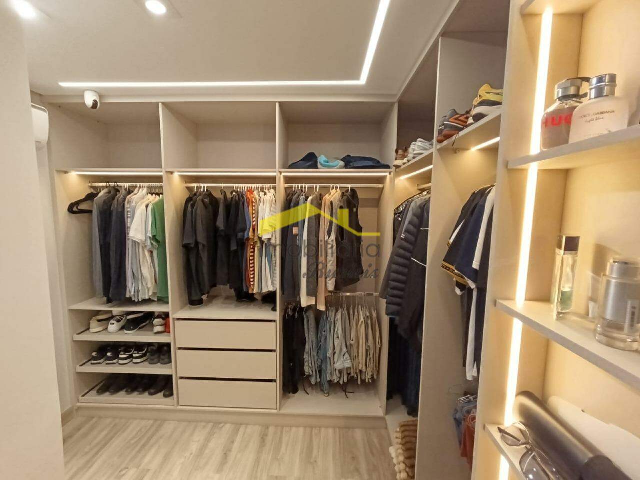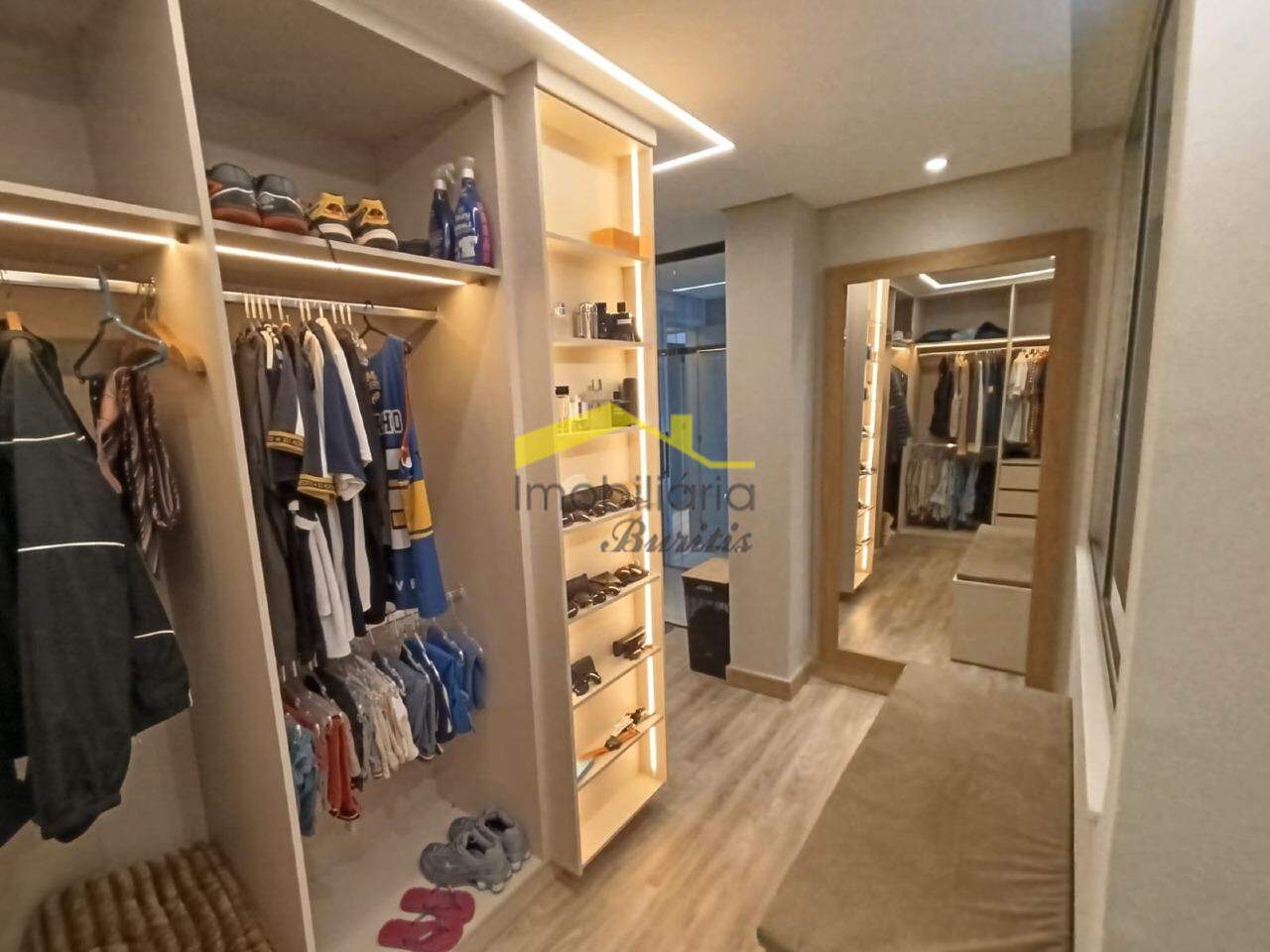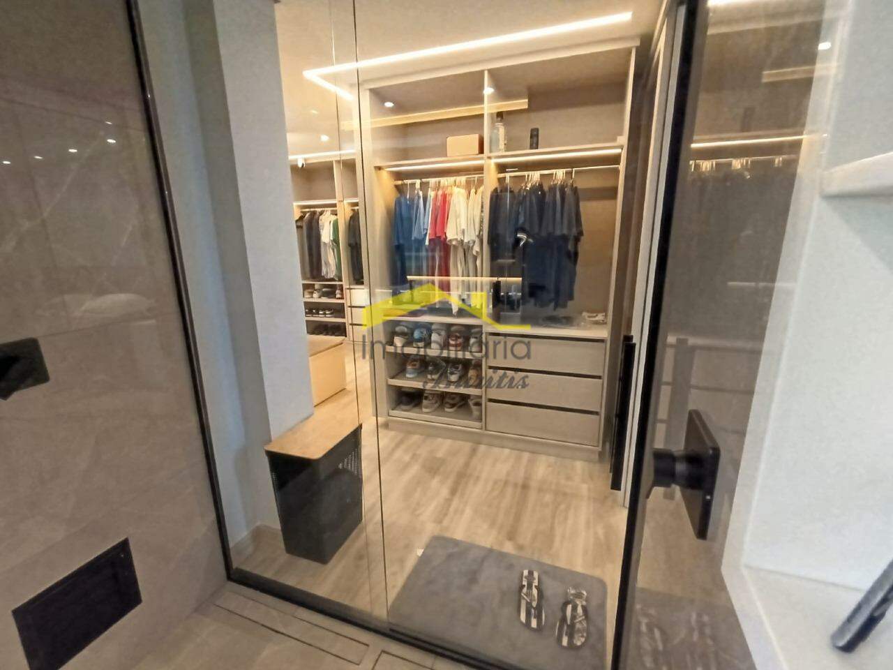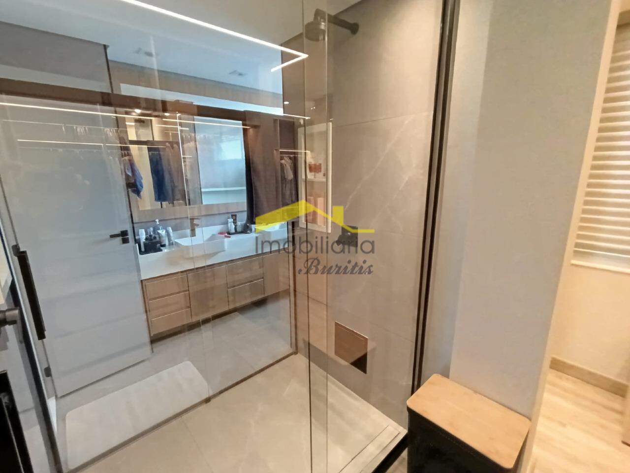 Segundo pavimento: 4 quartos com armários, sendo três em mármore e 1 em laminado de madeira. Banheiro social em porcelanato com bancada em mármore, armários, box e espelho. Rouparia. Banheiro da suíte em granito, bancada em granito, armário, box, espelho e banheira de hidromassagem. Quarto suíte com closet e varanda.