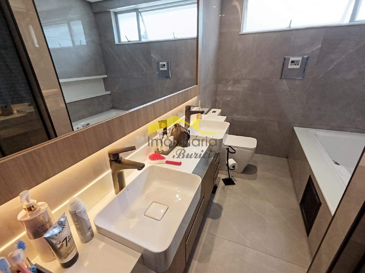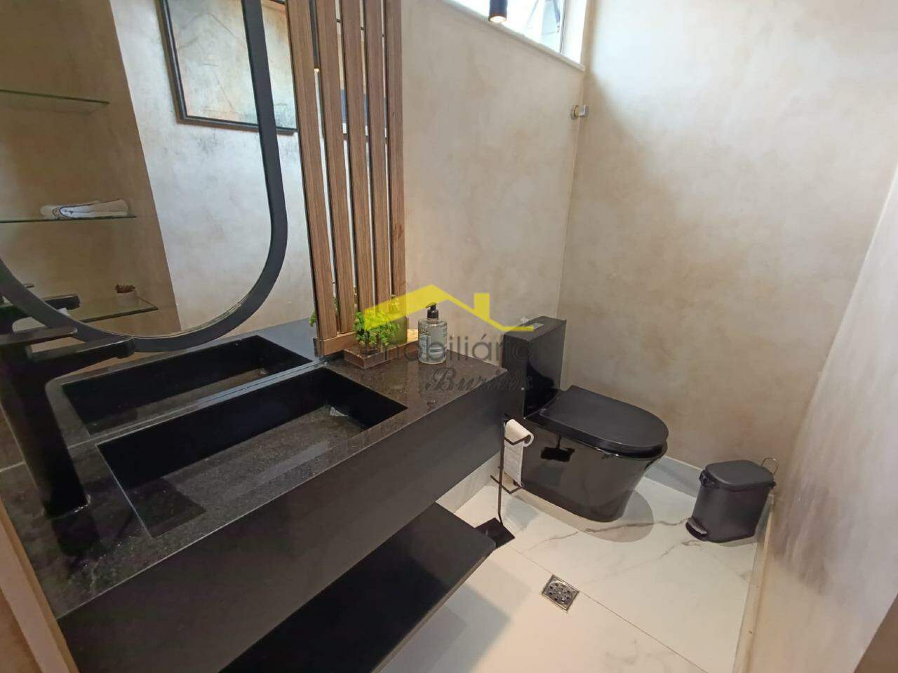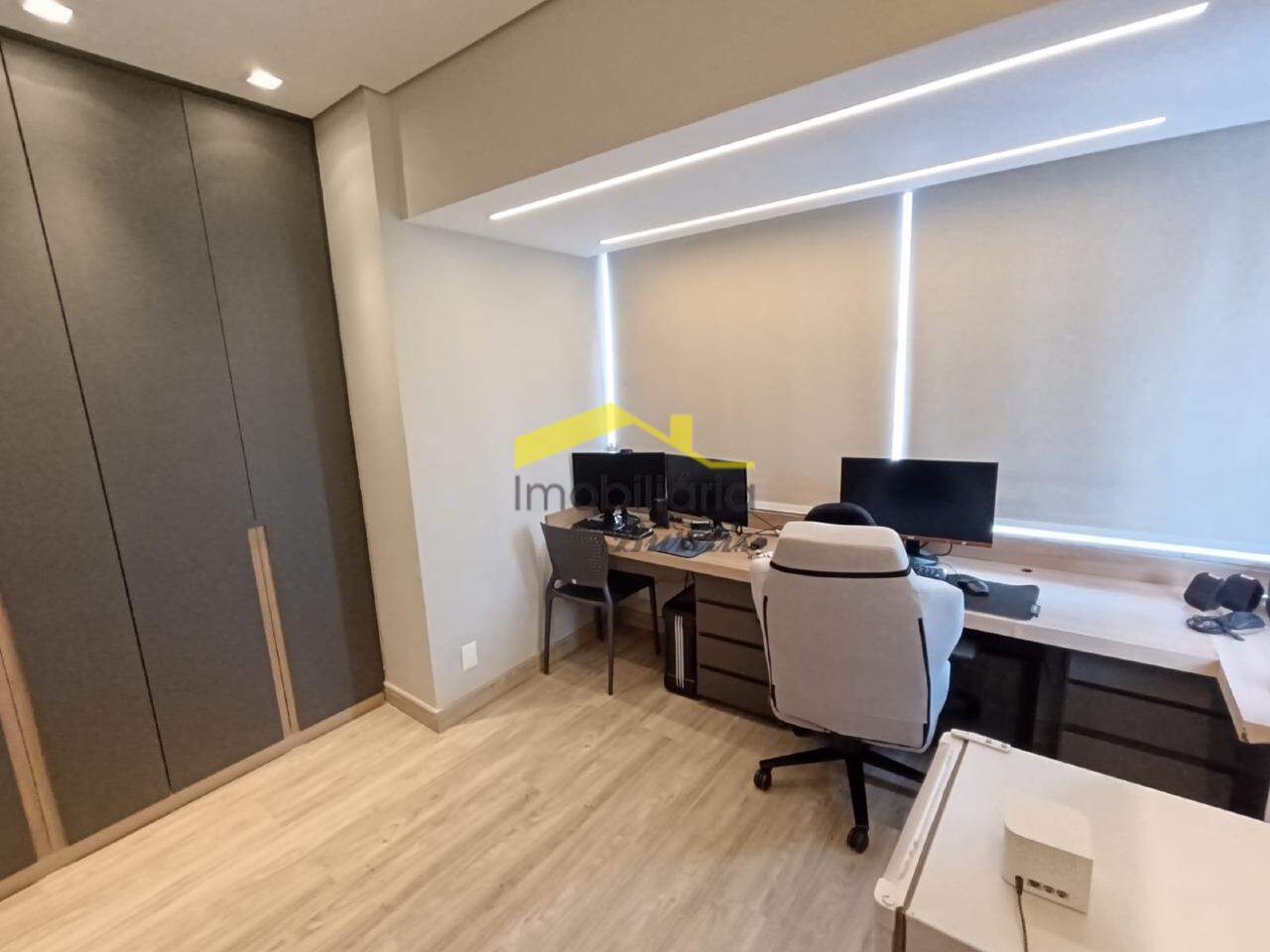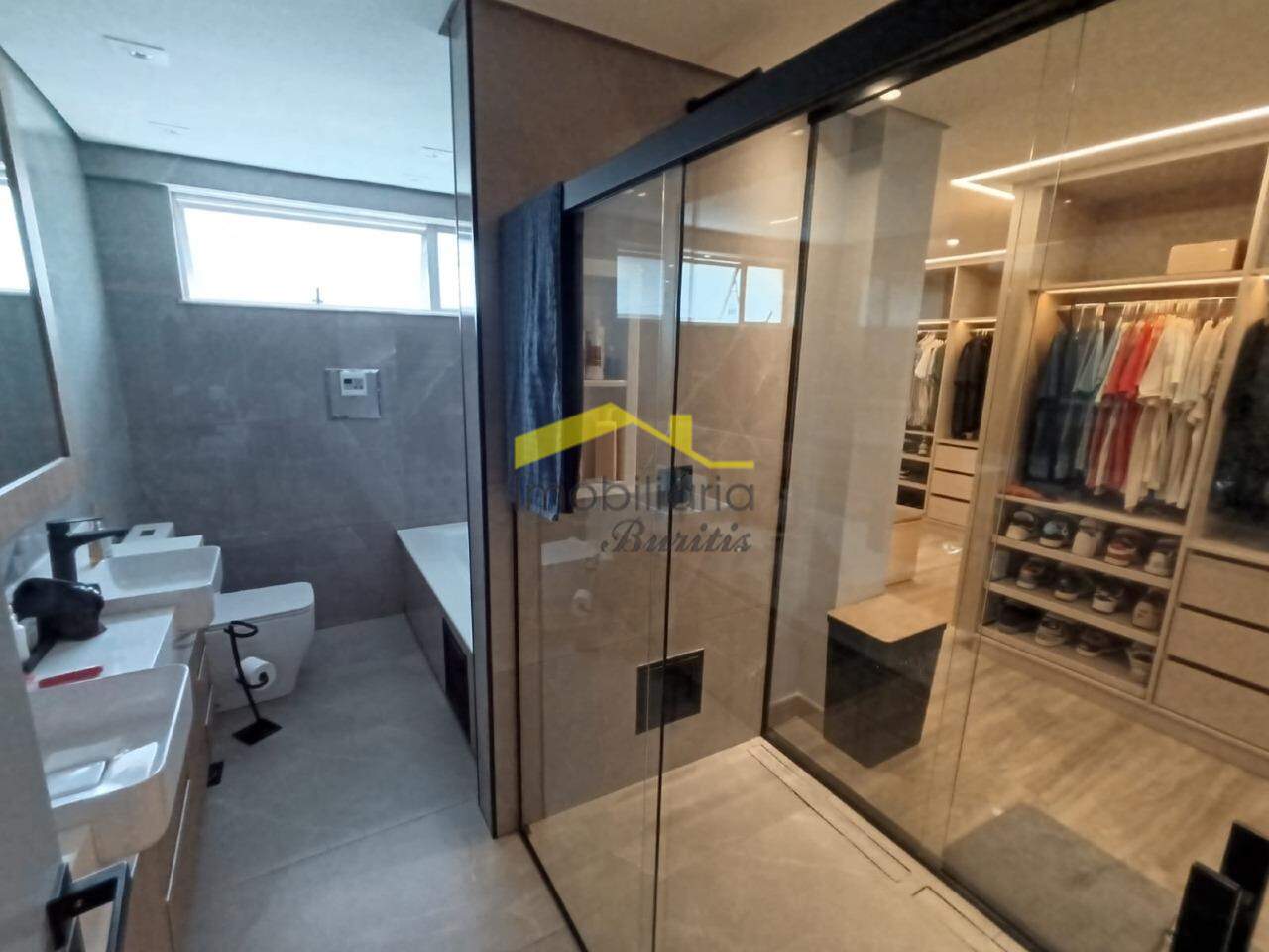 Segundo pavimento: 4 quartos com armários, sendo três em mármore e 1 em laminado de madeira. Banheiro social em porcelanato com bancada em mármore, armários, box e espelho. Rouparia. Banheiro da suíte em granito, bancada em granito, armário, box, espelho e banheira de hidromassagem. Quarto suíte com closet e varanda.