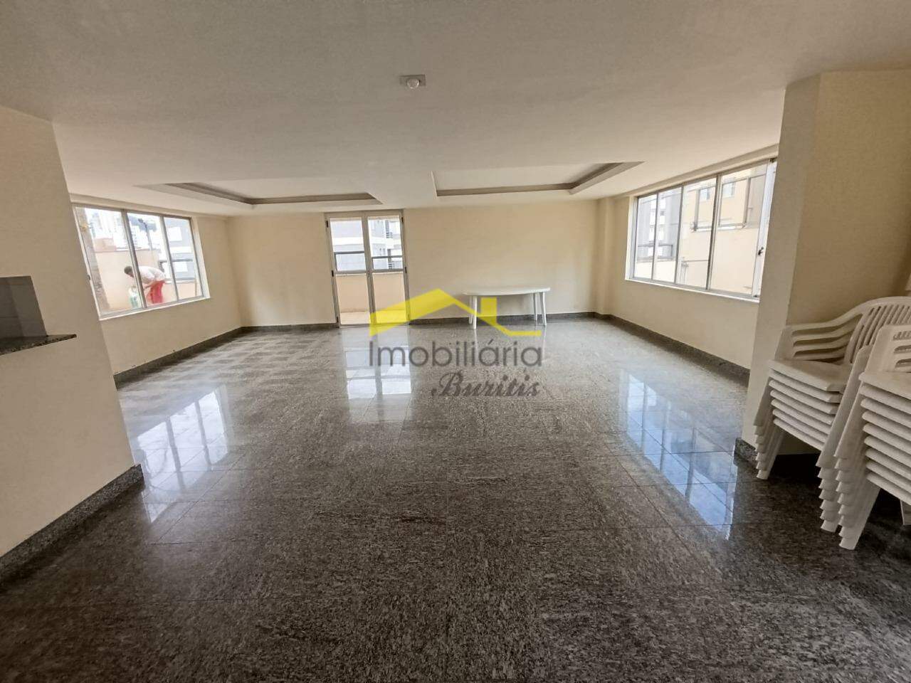 Prédio com salão de festas e piscina.