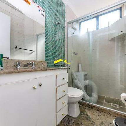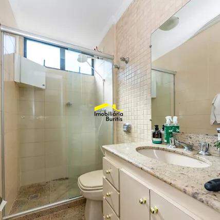 Banho social com piso em granito, armário e box blindex