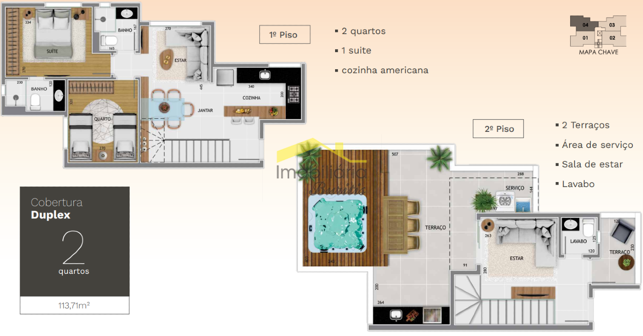 Cobertura de 2 quartos, sendo um suíte, banho social, sala para dois ambientes com cozinha tipo americana e área de serviço.