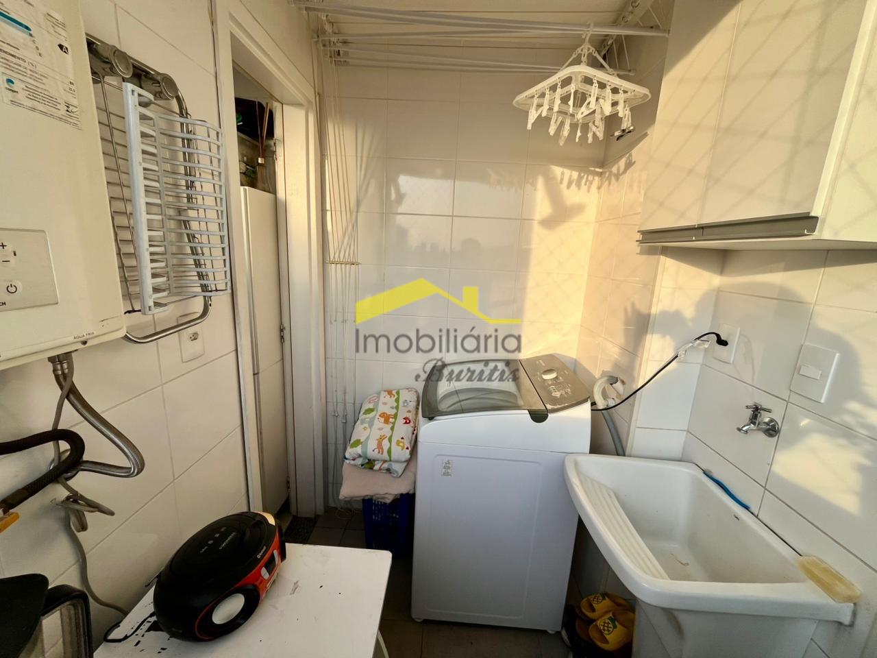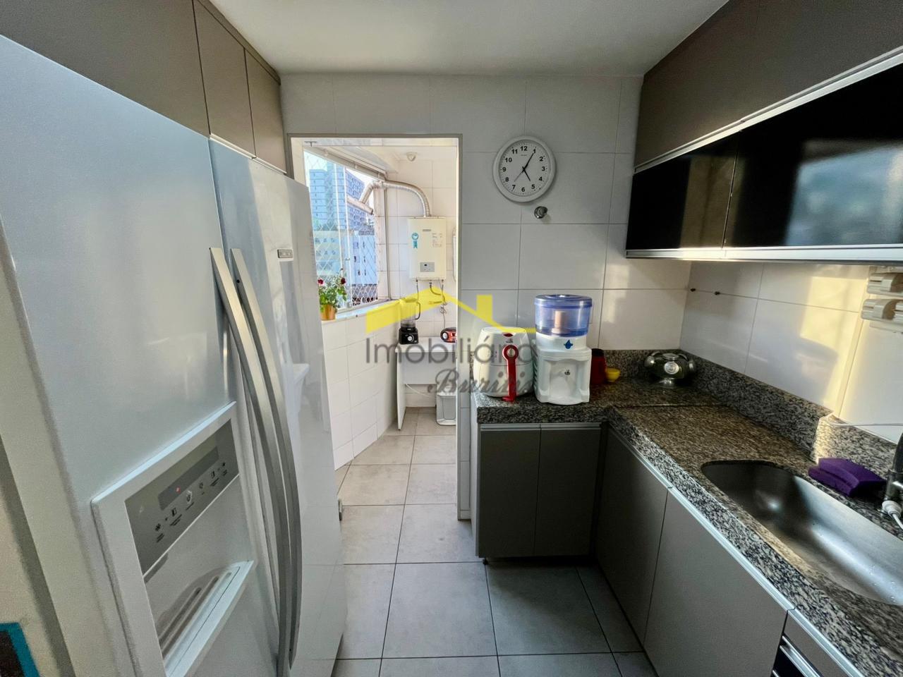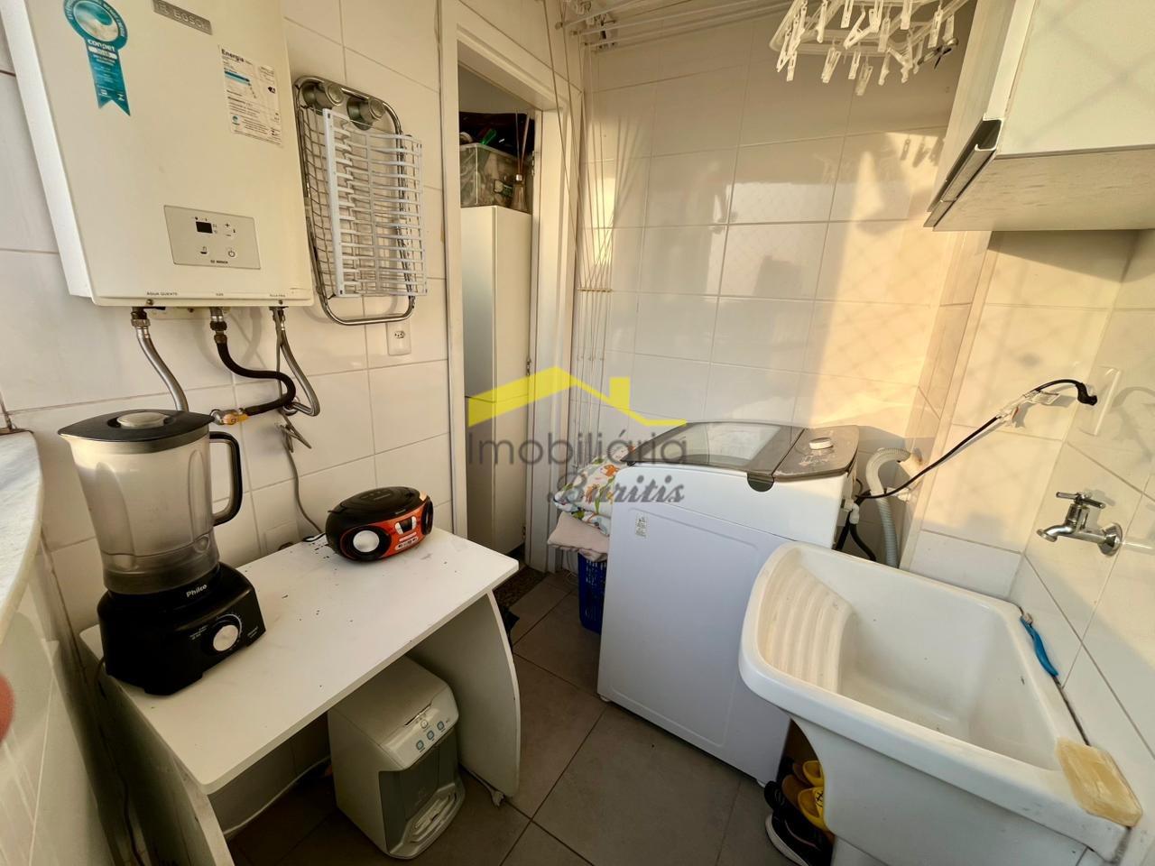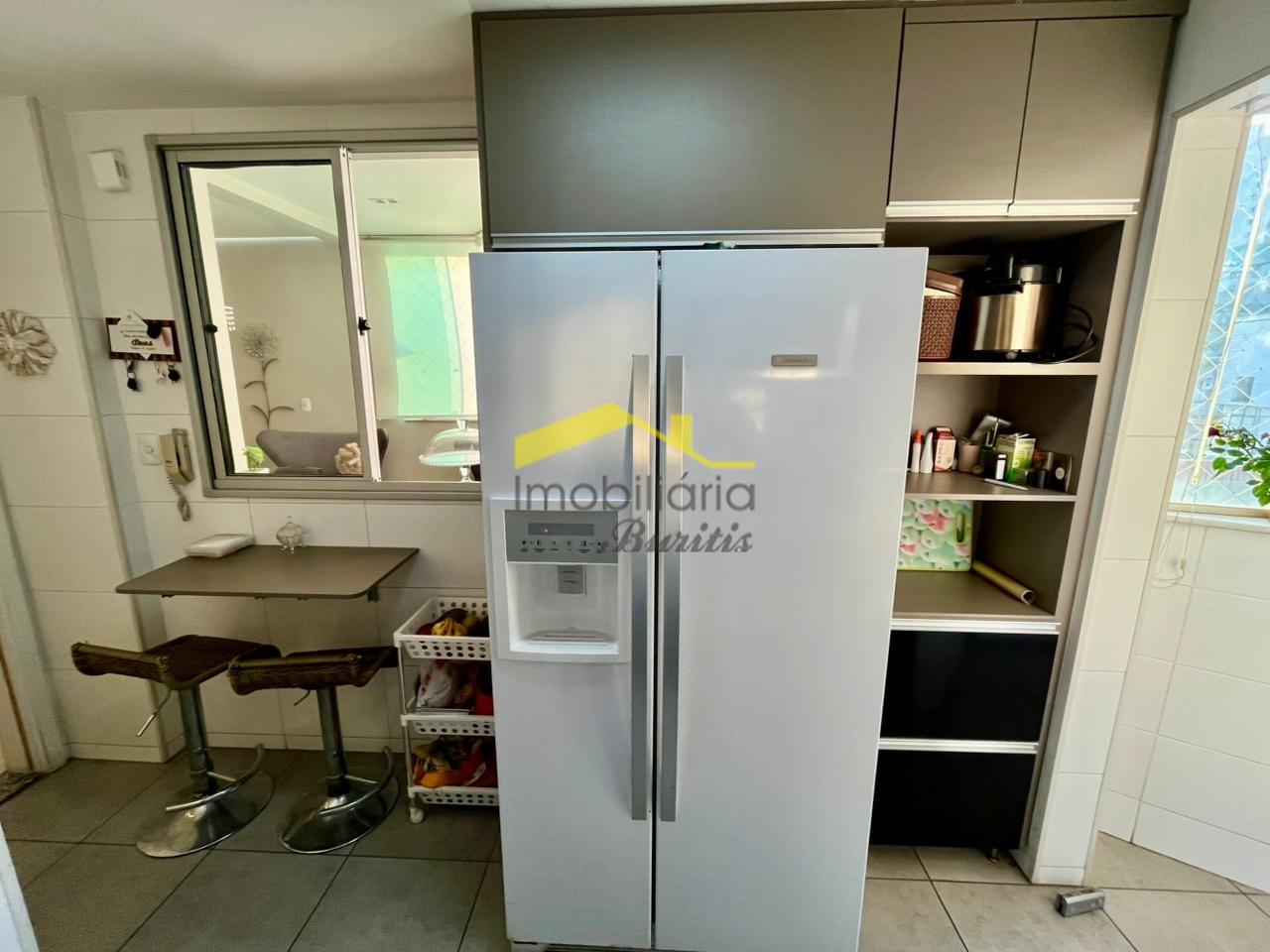 A cozinha é totalmente equipada, contando com fogão de 4 bocas, geladeira, micro-ondas e armários planejados, garantindo praticidade para o preparo das refeições. Ao lado, a área de serviço dispõe de tanque e máquina de lavar roupa, oferecendo total funcionalidade.