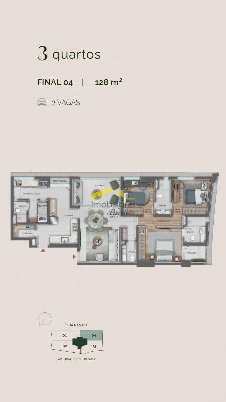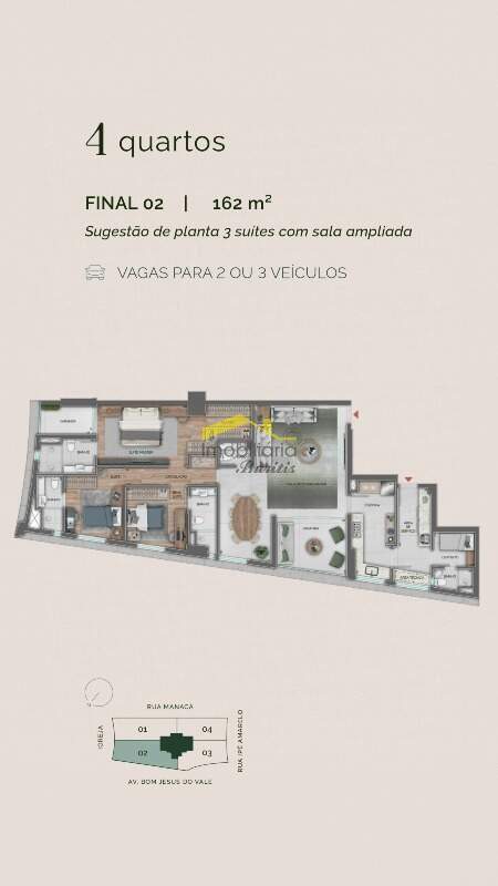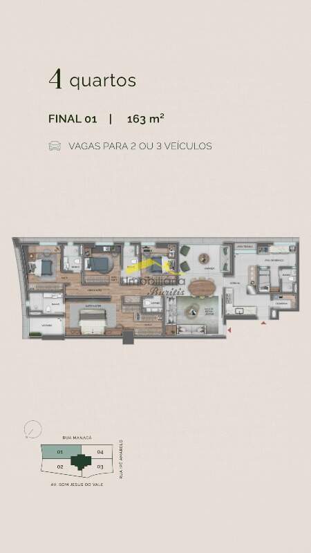 - Apartamentos Espaçosos: Escolha entre apartamentos de 3 quartos (128 m²) com 2 vagas de garagem ou unidades de 4 quartos (162 ou 163 m²) com 2 ou 3 vagas. Coberturas lineares exclusivas (255 ou 325 m²) oferecem 4 vagas e vistas deslumbrantes.