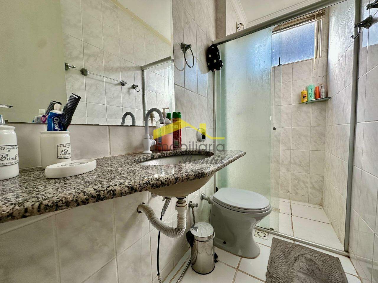 Banho social com piso em cerâmica, bancada em granito, armário e box em blindex