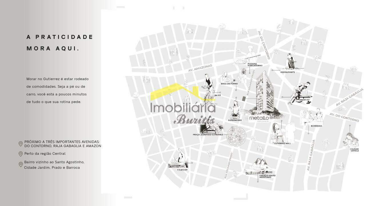 Viver no Metallo Residence é escolher morar com classe no coração do Gutierrez, um dos bairros mais valorizados de Belo Horizonte. Um empreendimento exclusivo, da renomada Construtora Sudoeste, pensado nos mínimos detalhes para proporcionar o conforto, a sofisticação e a praticidade que você e sua família merecem.