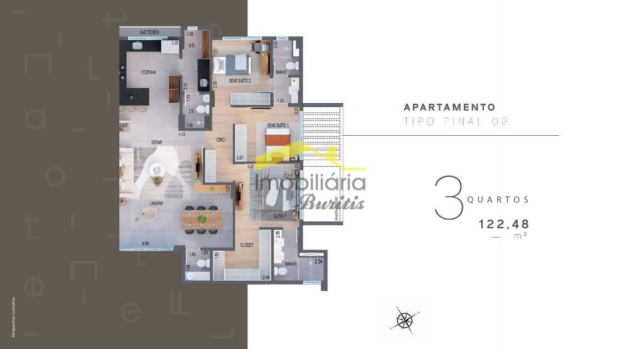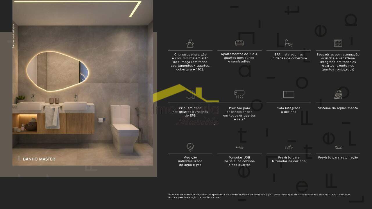 * Acabamentos premium: venezianas integradas com isolamento acústico, piso laminado nos quartos, previsão para automação e ar-condicionado em todos os quartos e sala