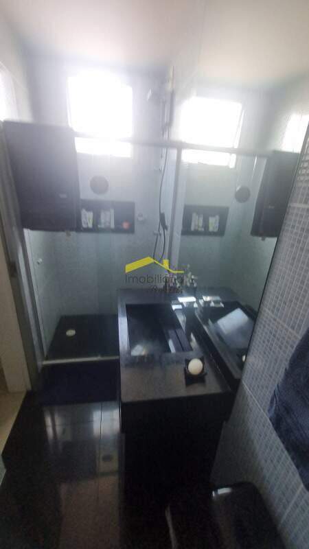 banheiro social com cubra sobreposta espelho blindex e armario.