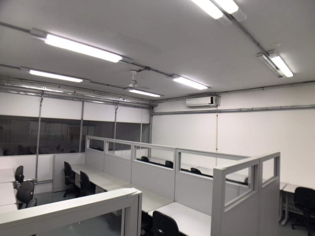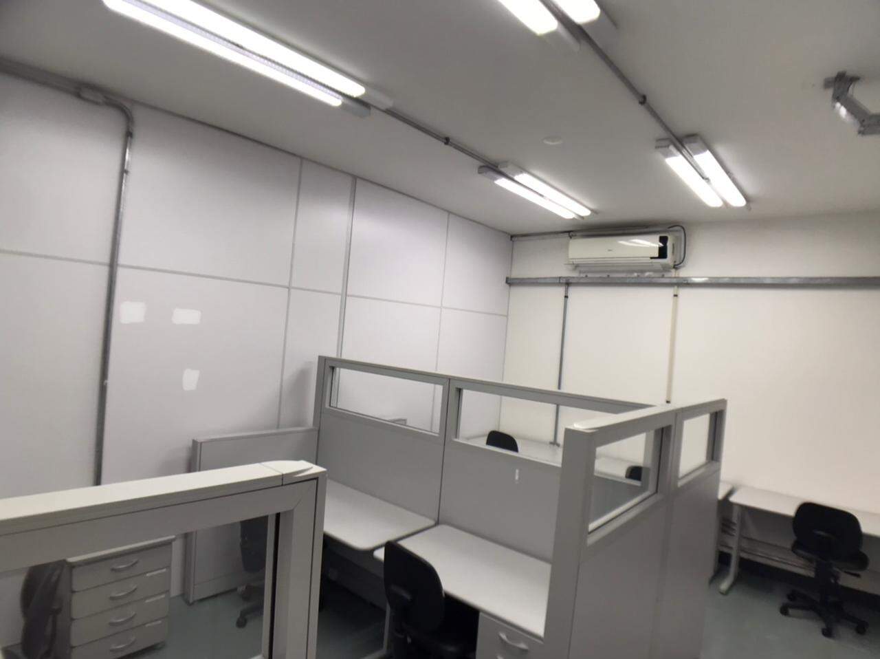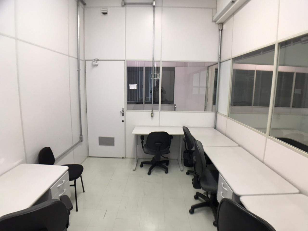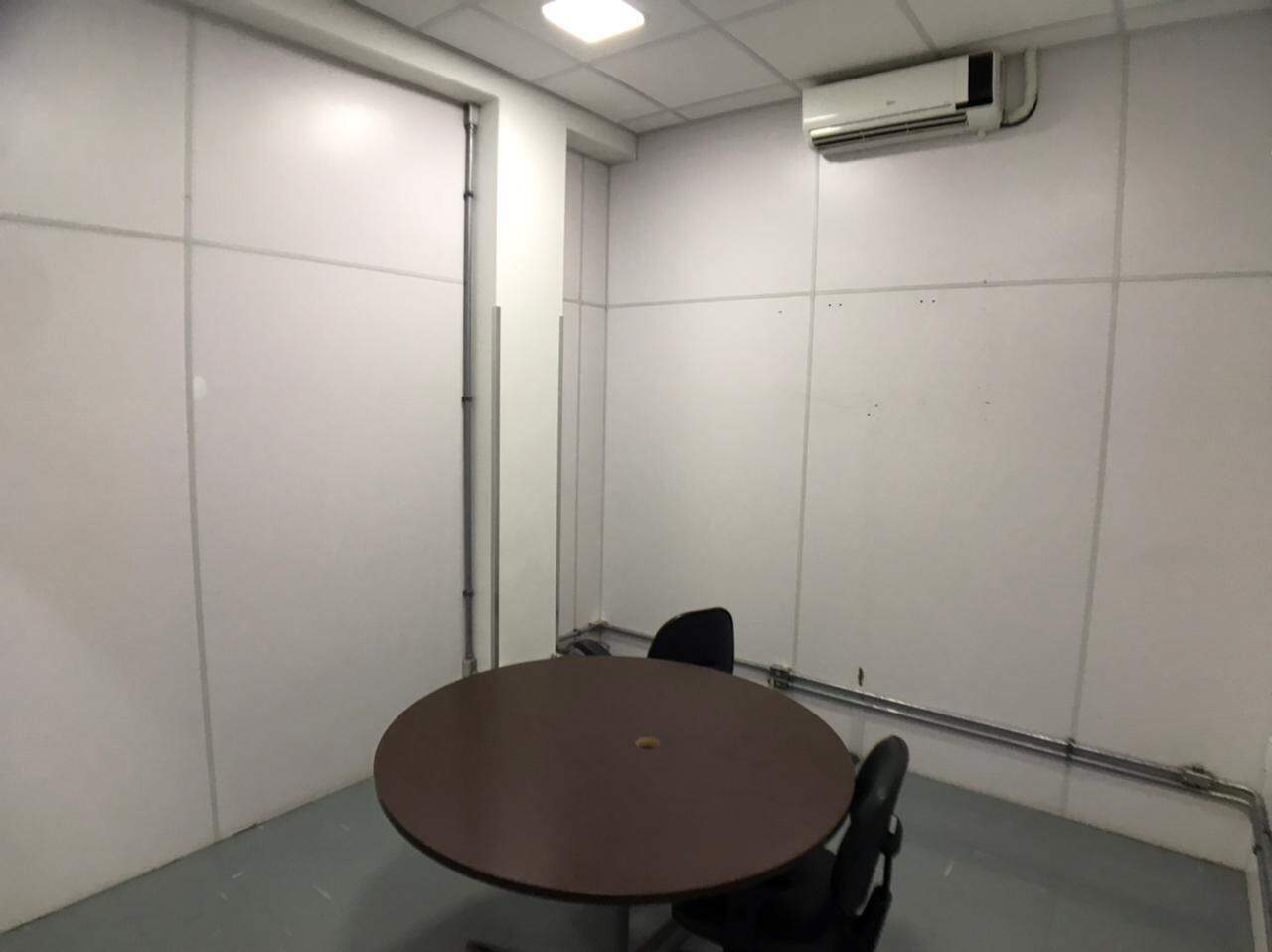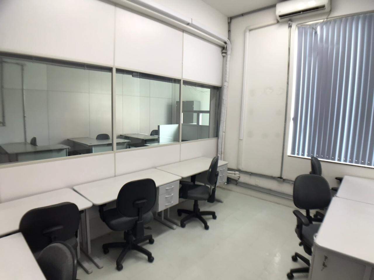 Prédio comercial, com elevador, salas com repartimentos, mesas e cadeiras de escritório, salas de reunião, ar-condicionado.