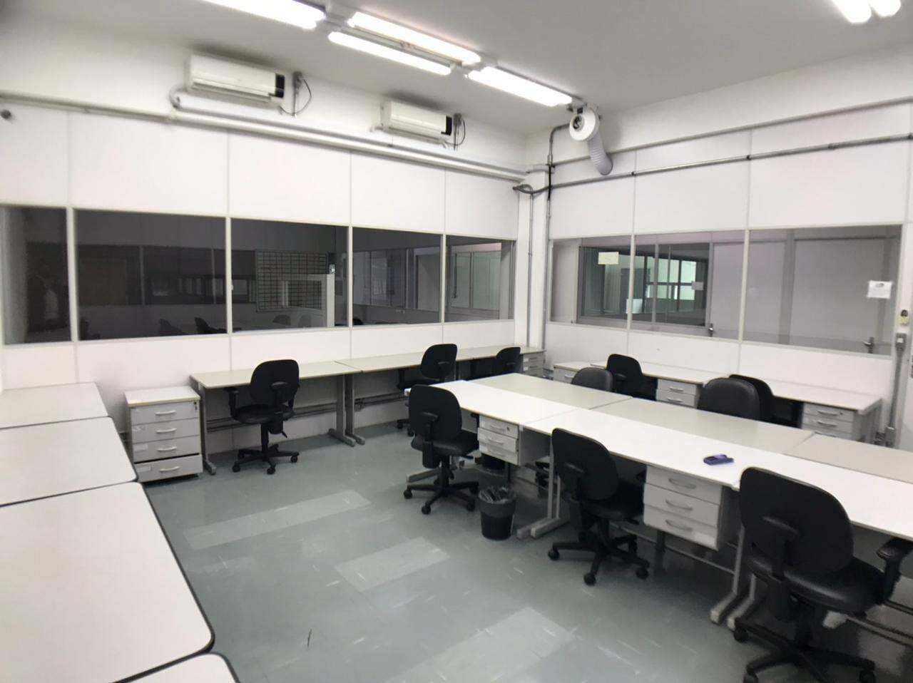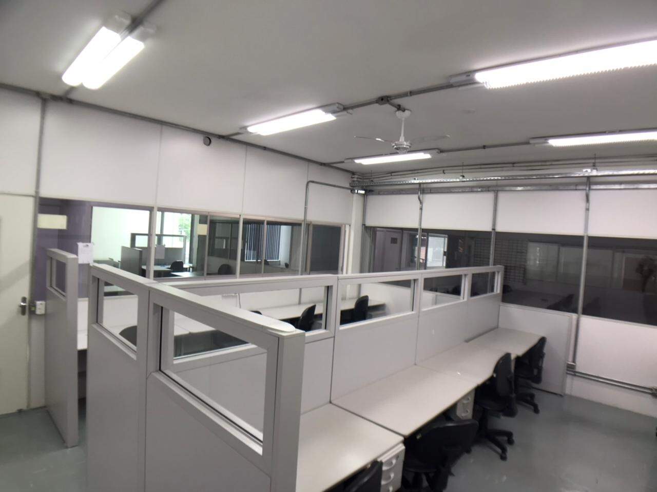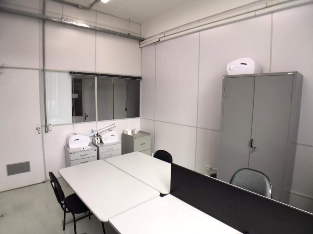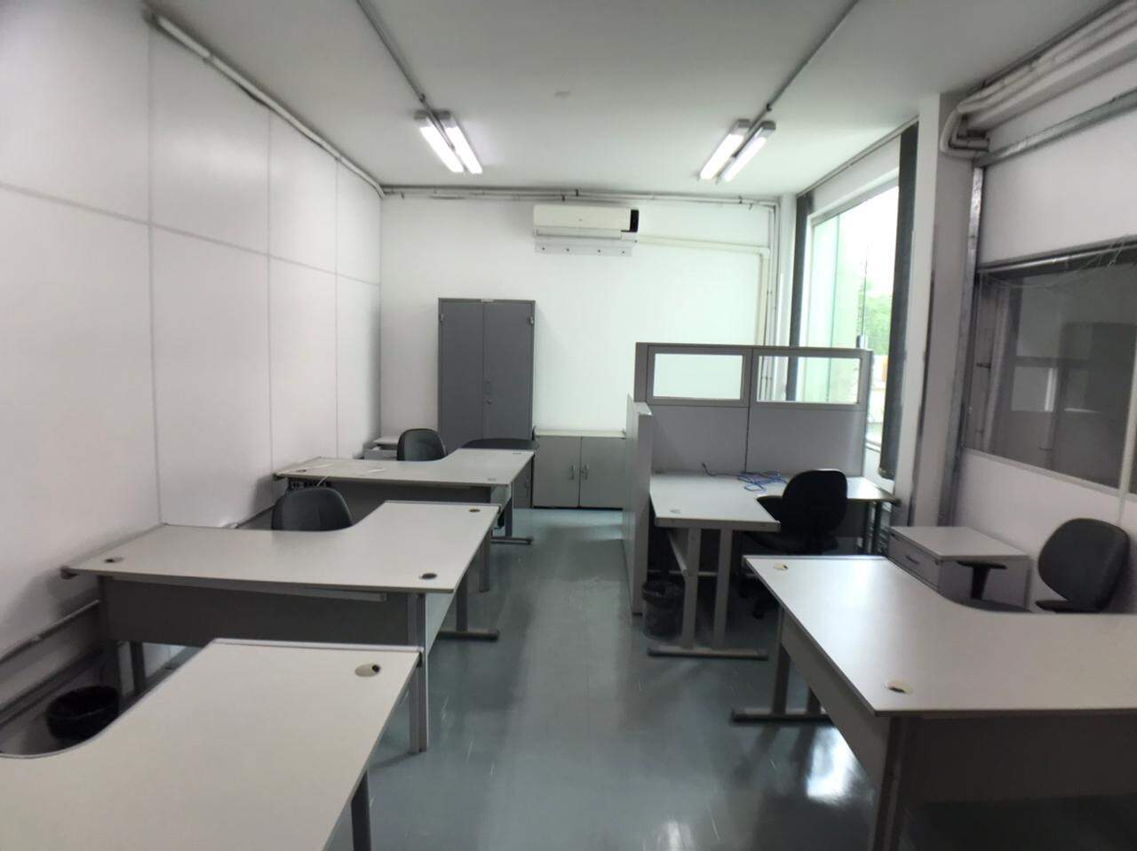 Prédio comercial, com elevador, salas com repartimentos, mesas e cadeiras de escritório, salas de reunião, ar-condicionado.