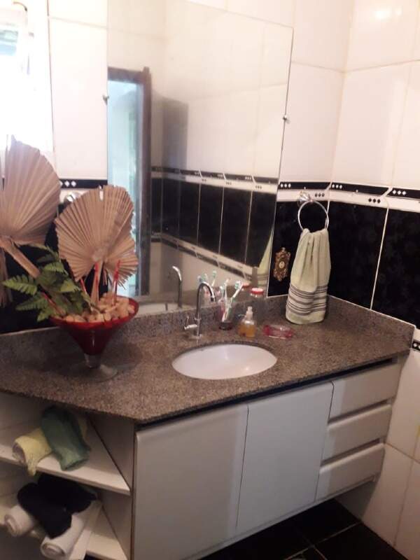 01 Banho social com bancada em granito, armário, box em blindex, espelho e piso em cerâmica.