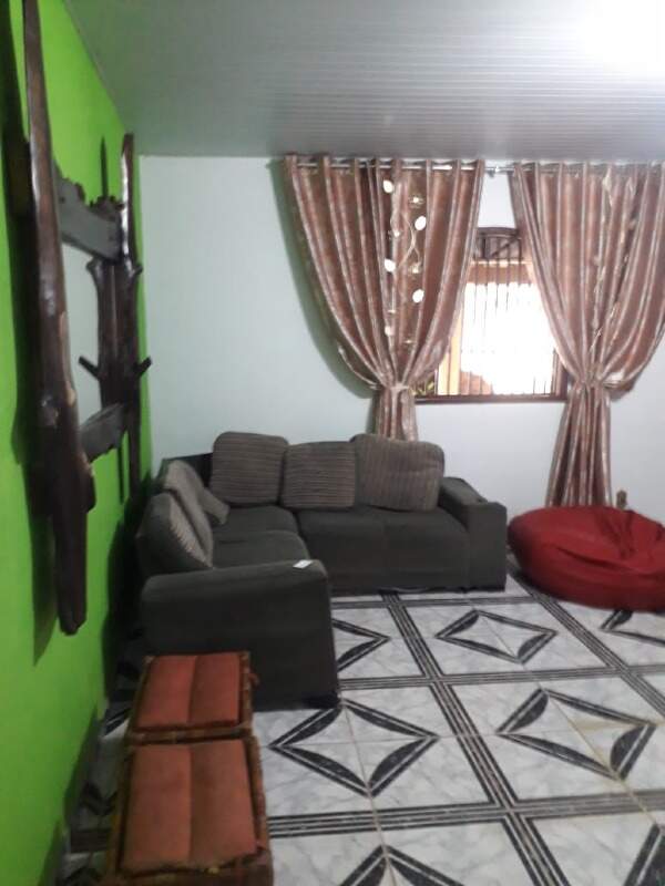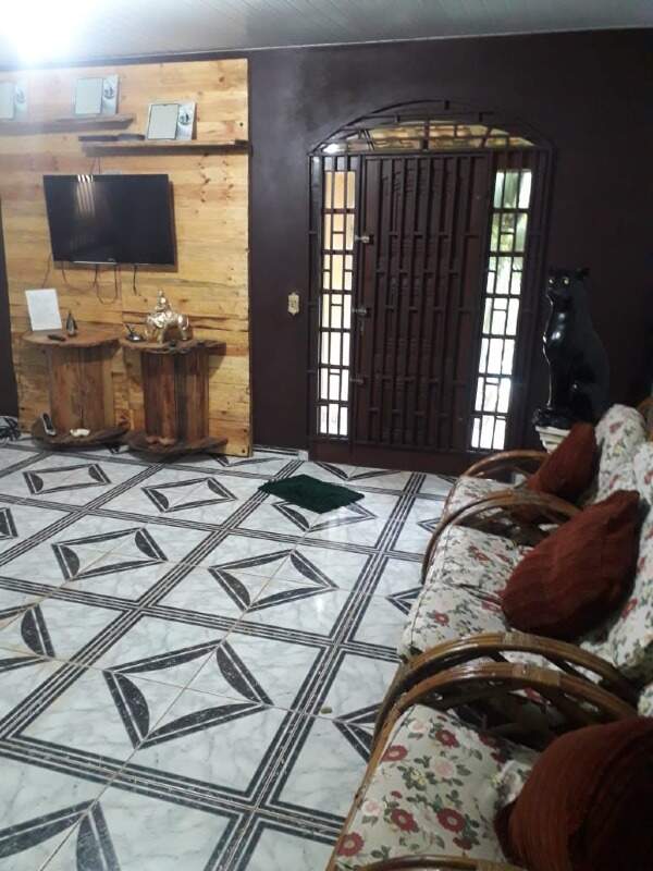 Casa com sala ampla para 2 ambientes, piso em cerâmica e painel de madeira.