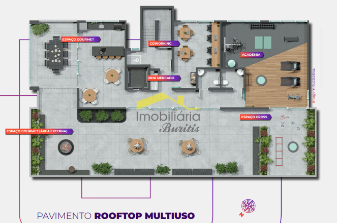 Lazer no rooftop: Espaço gourmet, academia com espaço cross, lavanderia compartilhada, coworking e mini mercado.